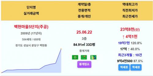 분당구 백현마을5단지(주공) 33평 23.8억 신고가