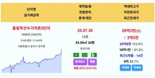 송파구 올림픽선수기자촌2단지 34평 29.3억 신고가