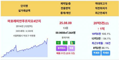 마포구 마포래미안푸르지오4단지 24평 20.5억 신고가
