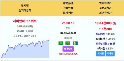 광진구 래미안파크스위트 33평 16.48억 신고가
