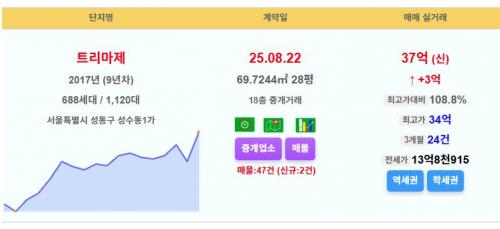 은평구 새절역두산위브트레지움 23평 8억 신고가
