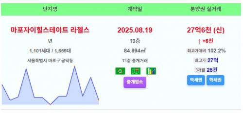 마포구 마포자이힐스테이트라첼스 33평 27.6억 신고가
