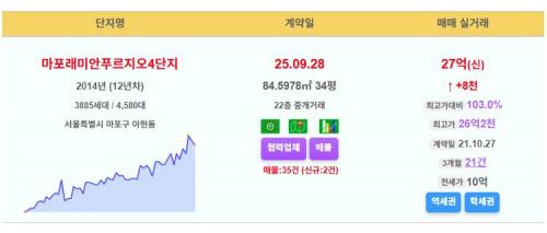 마포구 마포래미안푸르지오4단지 34평 27억 신고가
