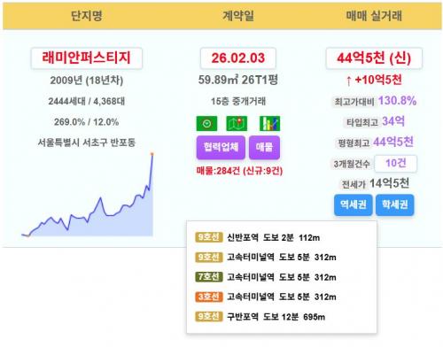 래미안퍼스티지 44.5억 신고가~!!