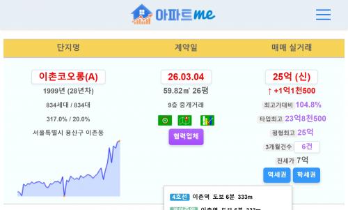 용산구 이촌코오롱(A) 26평 25억 신고가~!!