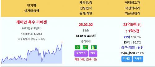 성동 래미안옥수리버젠(14년차) 33평 23.5억 신고가