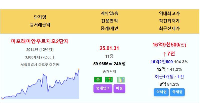마포래미안푸르지오2단지 24평 16.95억 신고가