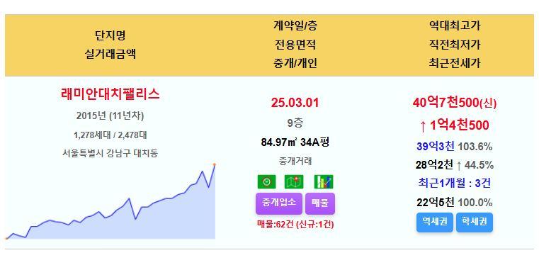 래미안대치팰리스(11년차) 34평 40.75억 신고가