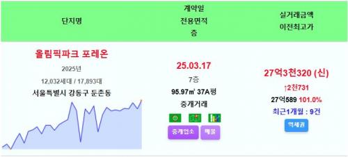 올림픽파크포레온 37평 27.33억 신고가