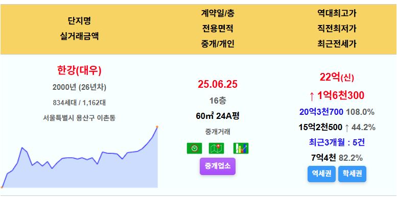 수도권 신고가순위 송파구(20) 분당(15)/강남(14)/영등포(10) 강동/성동/광진/서초/동작/마포/강서/서대문/부천 비수도권 신고가순위 부산(6)/울산(5)/인천(5)/대구(5)/대전(3) 오늘의 주요 신고가 (20~30평) https://apt2.me/apt/AptDaily.jsp 강남구 한양1차(영동한양) 27평 53억 신고가 용산구 한강(대우) 24평 22억 신고가 마포구 마포그랑자이 24평 21억 신고가 과천시 과천자이 25평 20.6억 신고가 서대문 힐스테이트신촌 34평 18억 신고가 영등포 아크로타워스퀘어 29평 17억 신고가 동작구 보라매자이더포레스트 25평 13.05억 신고가 강동구 고덕자이 25평 14.3억 신고가 동대문 이편한세상청계센트럴포레 29평 14.1억 신고가 분당구 아름마을(선경) 31평 17.2억 신고가 울산 라엘에스 34평 10.45억 신고가 대전 힐스테이트도안리버파크5단지 33평 8.09억 신고가 대구 범어목련 20평 7.8억 신고가
