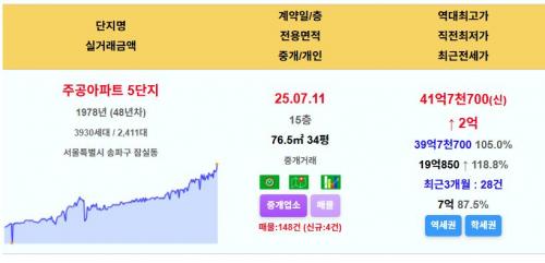 송파구 잠실주공5단지 34평 41.77억 신고가