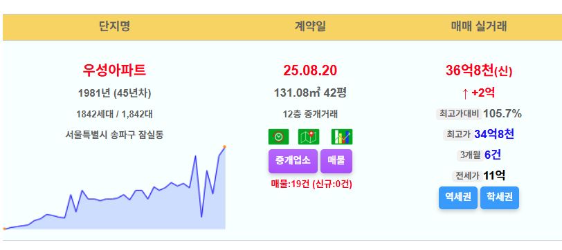 송파구 우성 42평 36.8억 신고가