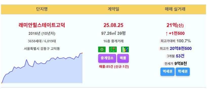 강동구 래미안힐스테이트고덕 39평 21억 신고가