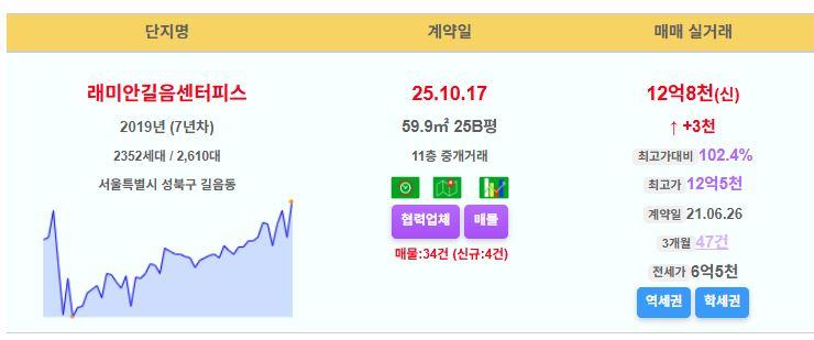 성북구 래미안길음센터피스 25평 12.8억 신고가