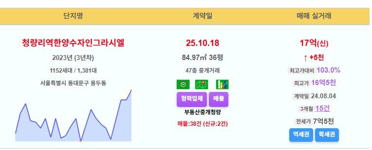 동대문구 청량리역한양수자인그라시엘 36평 17억 신고가