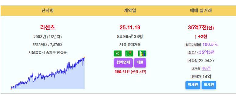 송파구 리센츠 33평 35.7억 신고가