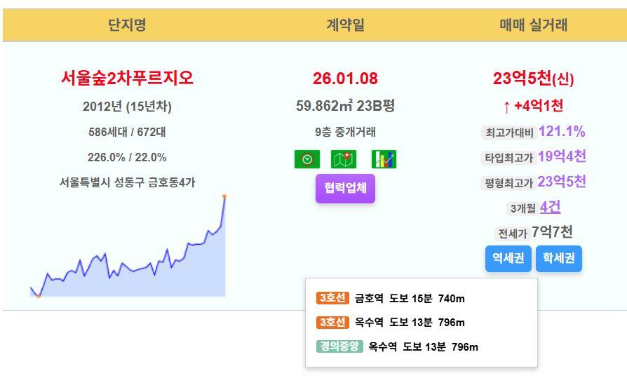 성동구 서울숲2차푸르지오 23평 23.5억 신고가