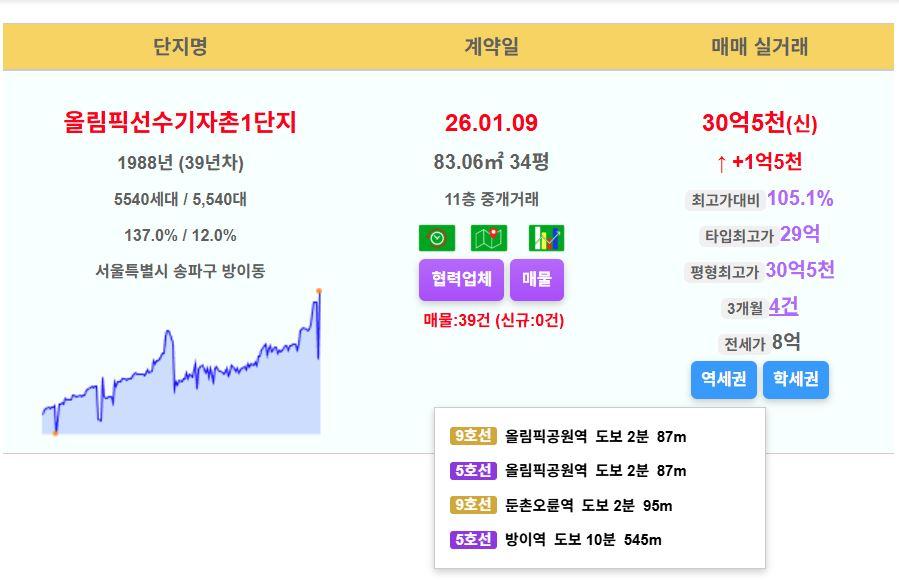 송파구 올림픽선수기자촌1단지 34평 30.5억 신고가