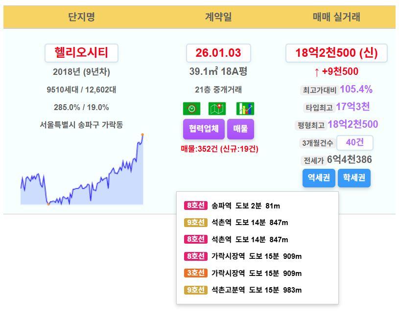 송파구 헬리오시티 18평 18.25억 신고가