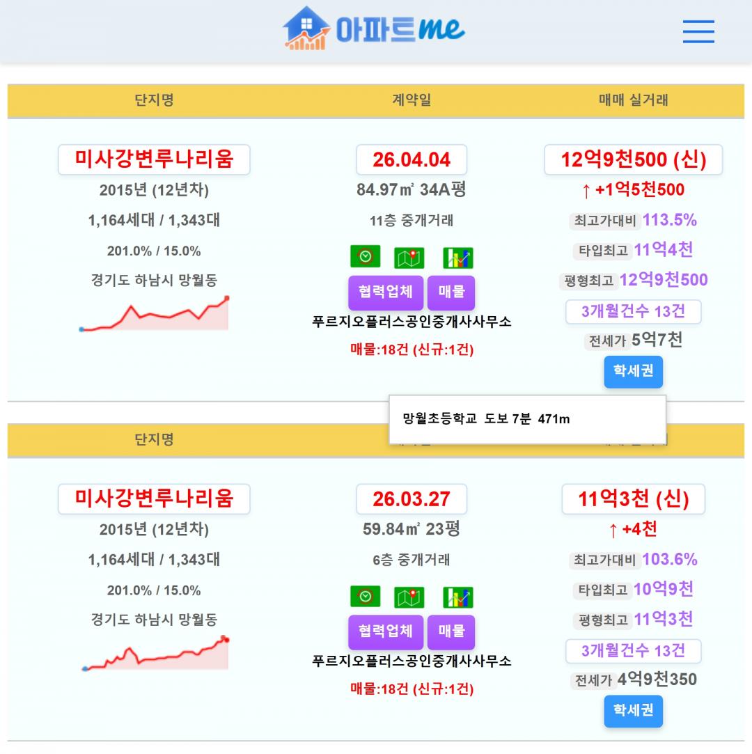미사강변루나리움 34평 12.95억 신고가~!!