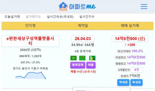 용인시 기흥구 e편한세상구성역플랫폼시티 14.88억 신고가~!!