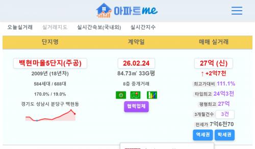성남시 분당구 백현마을5단지(주공) 27억 신고가~!!