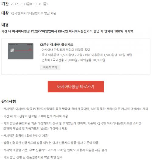 어제 아시아나항공 고객센터, 국민카드 고객센터 양 사에 전화 문의를 했는데, 두 회사 모두 ‘KB국민 아시아나 올림카드’를 신규 발급받은 회원만 가능하다고 했습니다. 아시아나항공에서도 기존 국민카드 회원도 아시아나 올림카드 추가 발급자는 연회비가 면제 된다고 했습니다. | ||
