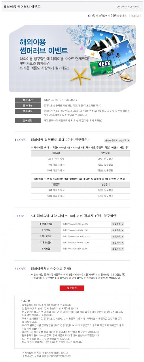 PC웹 : 롯데카드 홈페이지 -> 이벤트,혜택 -> 이벤트 -> 진행중 이벤트 -> 해외이용 썸머러브 이벤트 | ||