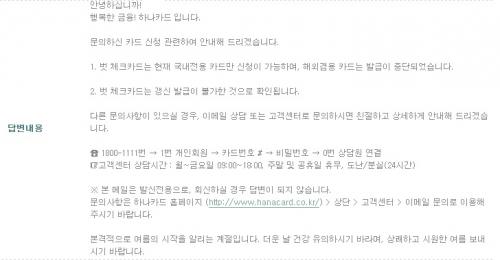 벗 체크카드 단종여부에 대해 하나카드에 물어봤습니다.