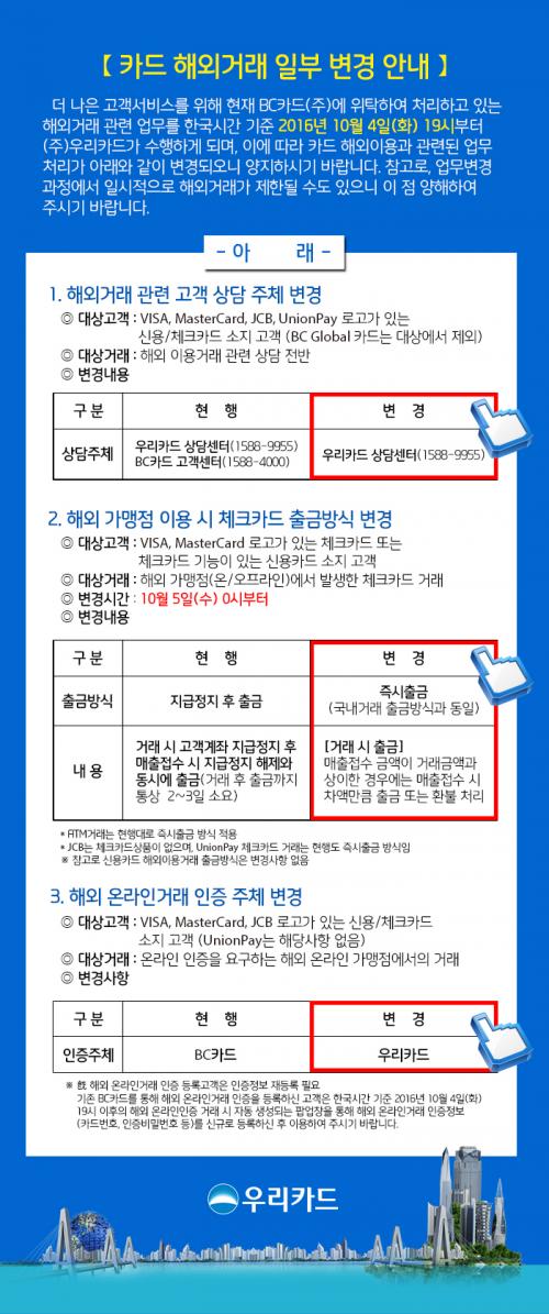 10월 4일 이후: 해외결제 문의 우리카드 고객센터로. (BC 글로벌 제외)