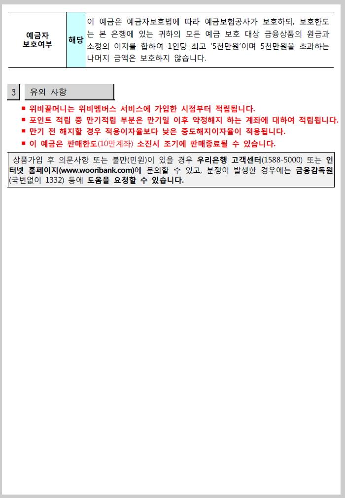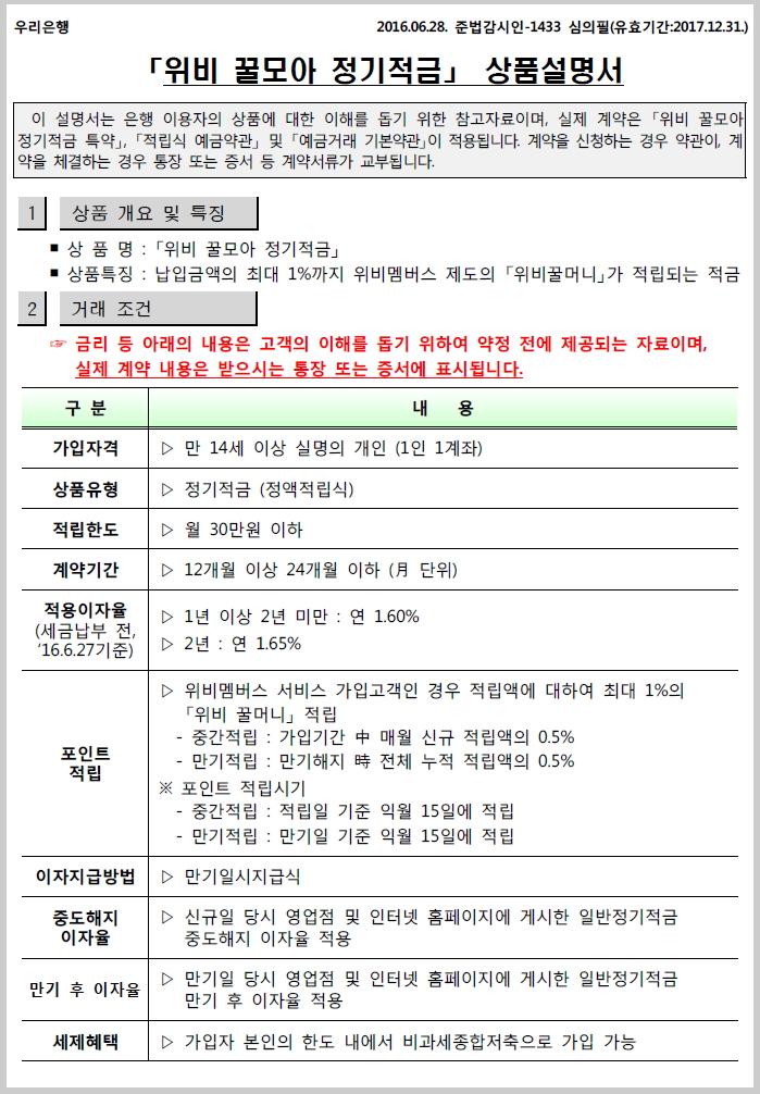 - 적금 기본금리에 추가로 적금납입금액의 1%를 위비꿀머니로 제공하여, 1년 정기적금 기준 최고 연 3.44% 금리수준