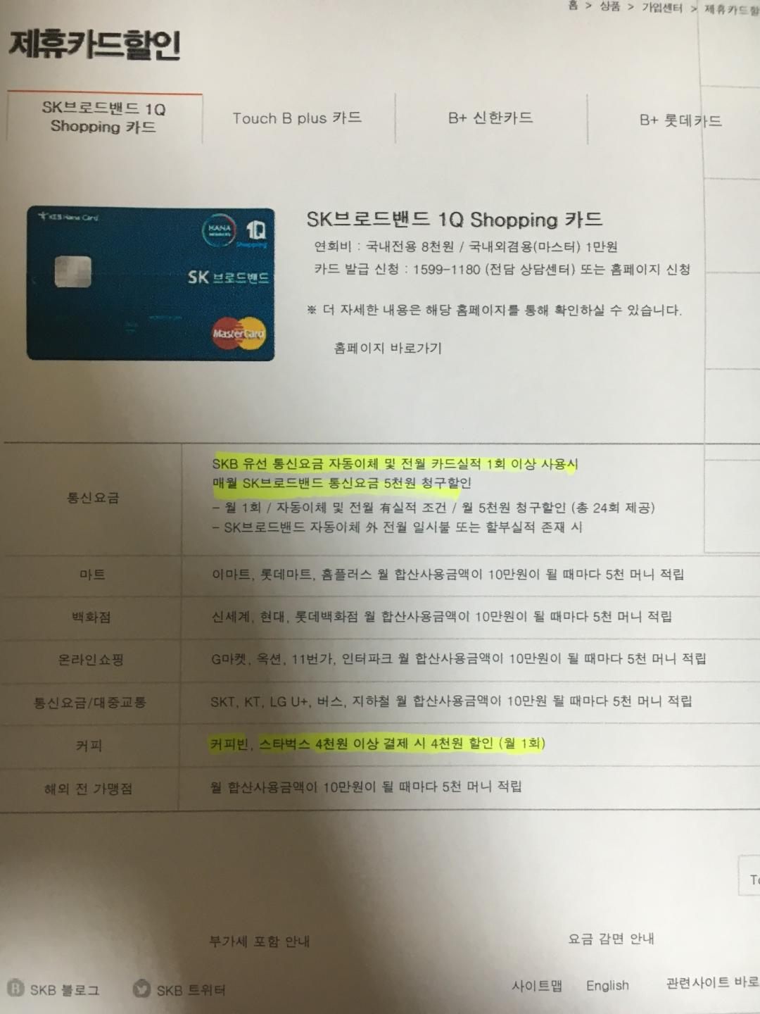 그래서 카드 이것 저것 보다가 시럽카드랑 sk브로드밴드 1q shopping 좋아 보이네요^^