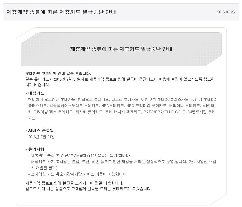 일부 롯데카드가 2016년 7월 31일자로 제휴계약 종료로 인해 발급이 중단되오니 이용에 불편이 없으시도록 참고하시기 바랍니다.
