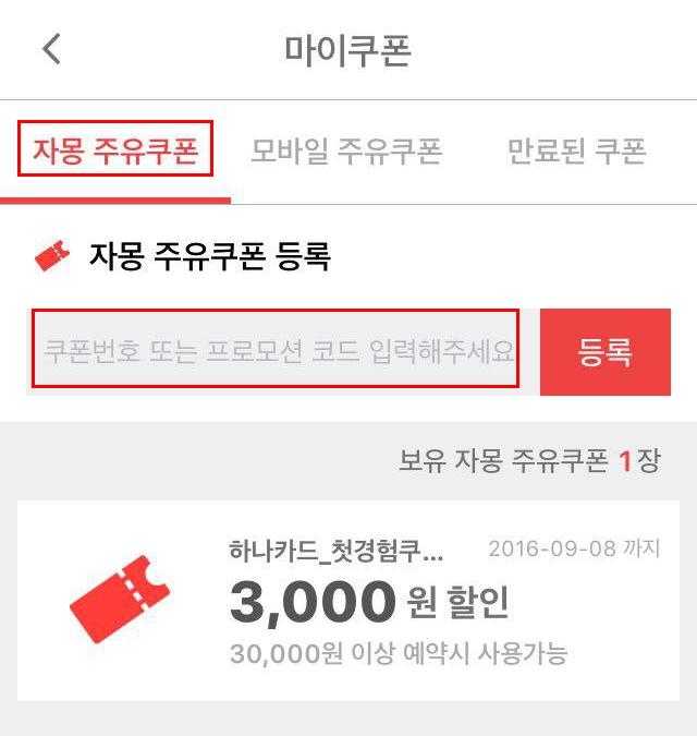 - 마이쿠폰 내 프로모션 코드 입력 란에 "hana0726" 입력 시 주유할인권 3000원 자동 발급