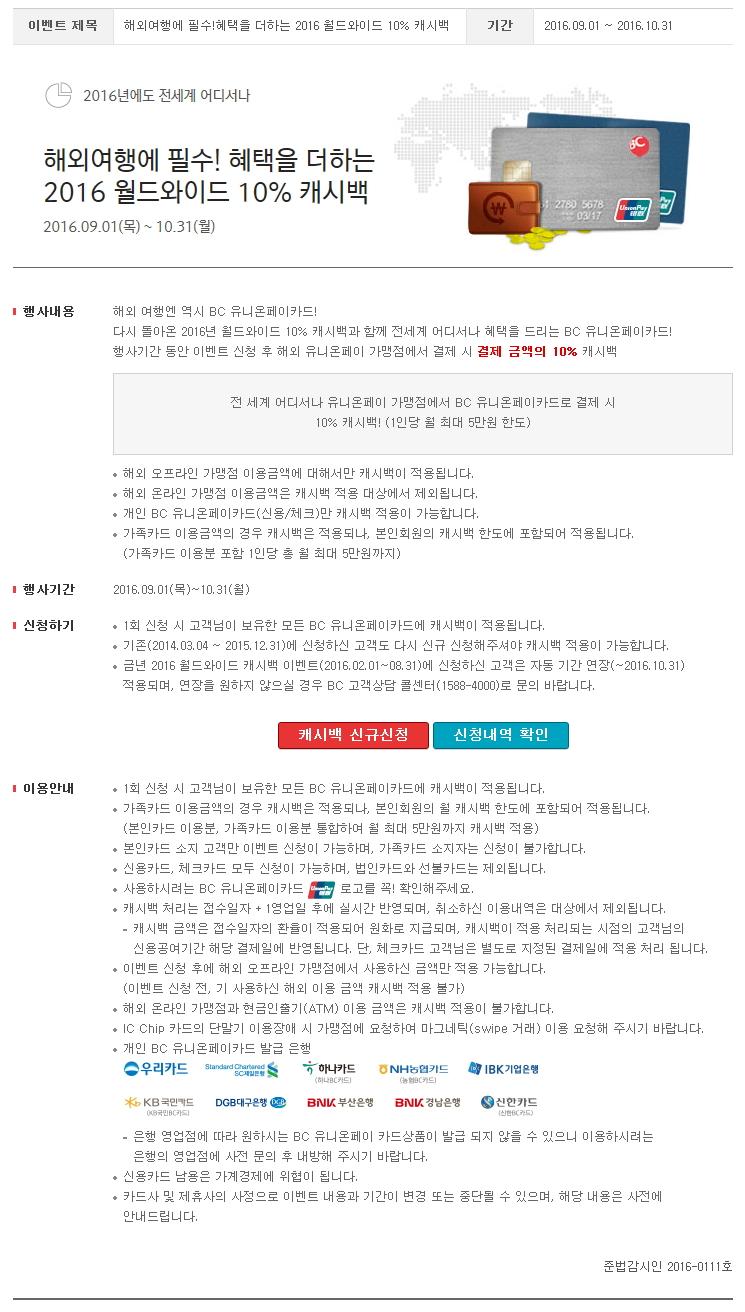 BC, 유니온페이, 10% 캐시백, 1인당 월 최대 5만원 한도