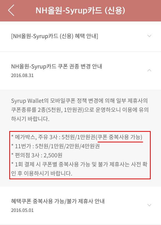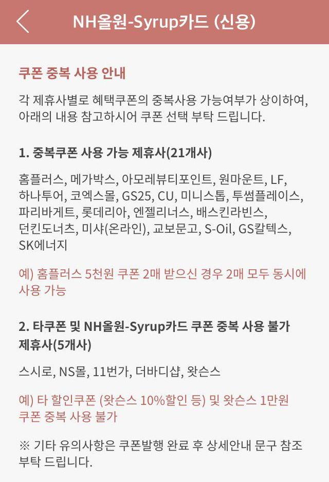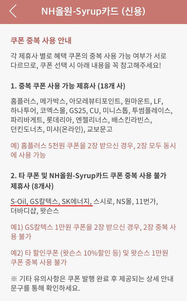 알림 > NH올원 Syrup카드 쿠폰 권종 변경안내에서 정유사 3사는 중복가능으로 나오지만