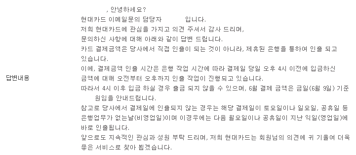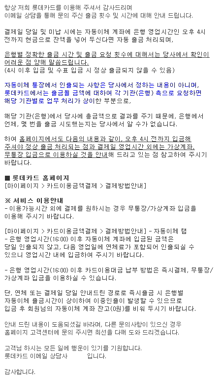 전업계 카드사의 경우 삼성카드는 결제계좌 은행업무 처리시간에 따라 달라지고, 나머지인 현대, 롯데카드사의 경우는 오후 4시 마감입니다. 그리고 같은 계열의 은행, 카드사의 경우는 인출마감 시간이 기사처럼 적용되겠지만, 같은 계열의 신용카드사, 은행이 아닐 경우 인출시간은 불확실합니다.