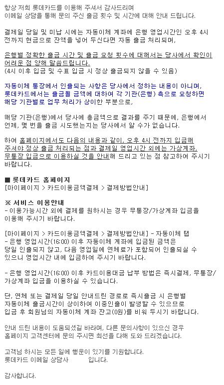 보통 신용카드 이용자들은 결제일 자정까지만 신용카드 이용대금을 입금하면 연체가 되지 않는 것으로 판단하고 있다.