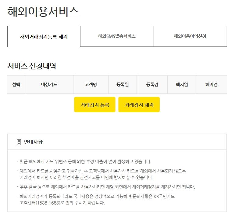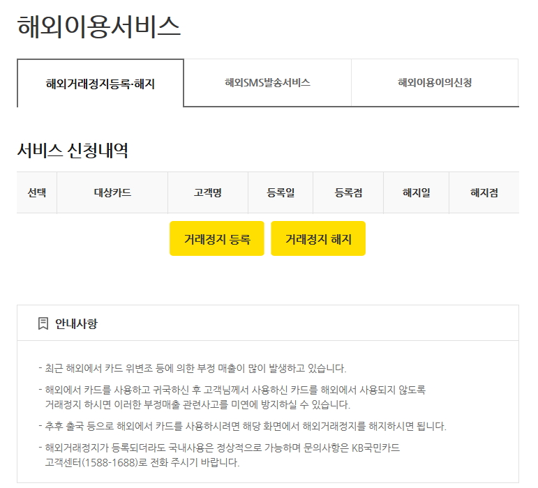 서비스 > 편의서비스 > 해외이용서비스 > 해외거래정지 등록, 해제