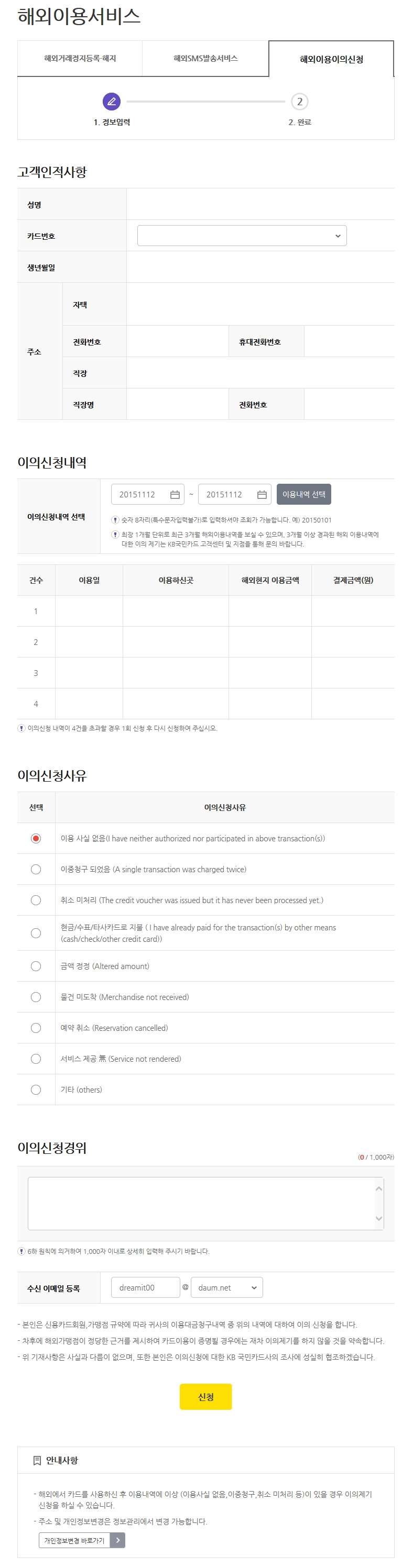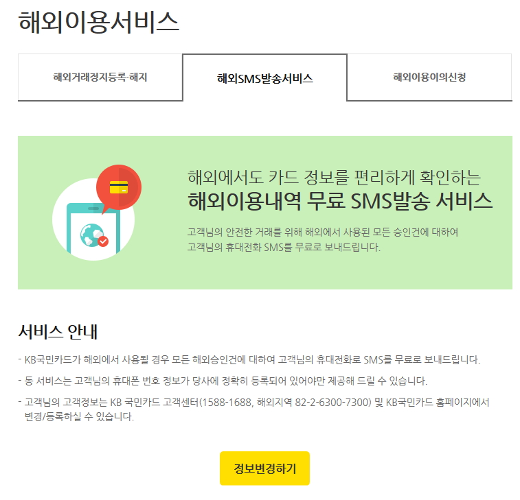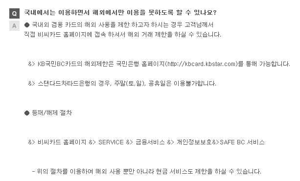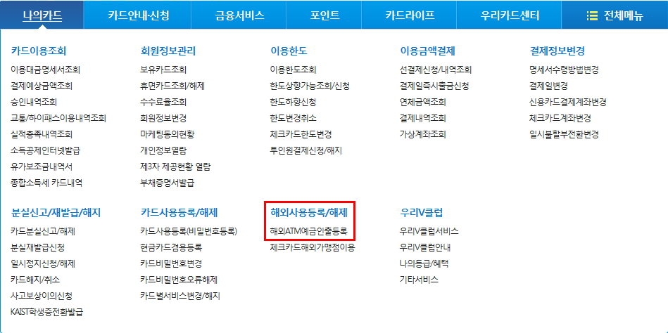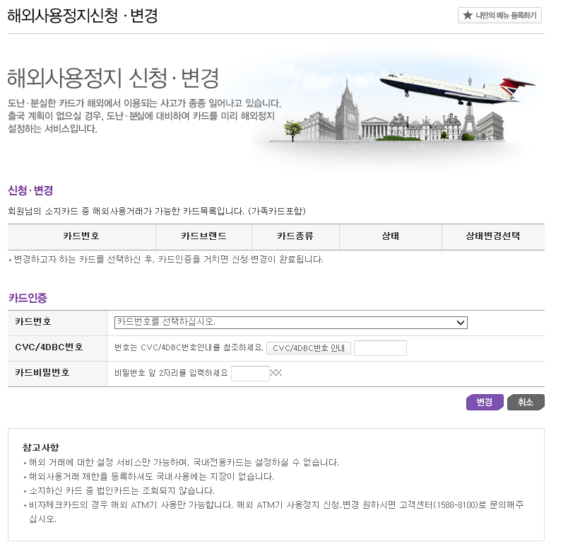 My account > 카드/개인정보관리 > 부가서비스 조회/변경 > 해외이용 제한 신청