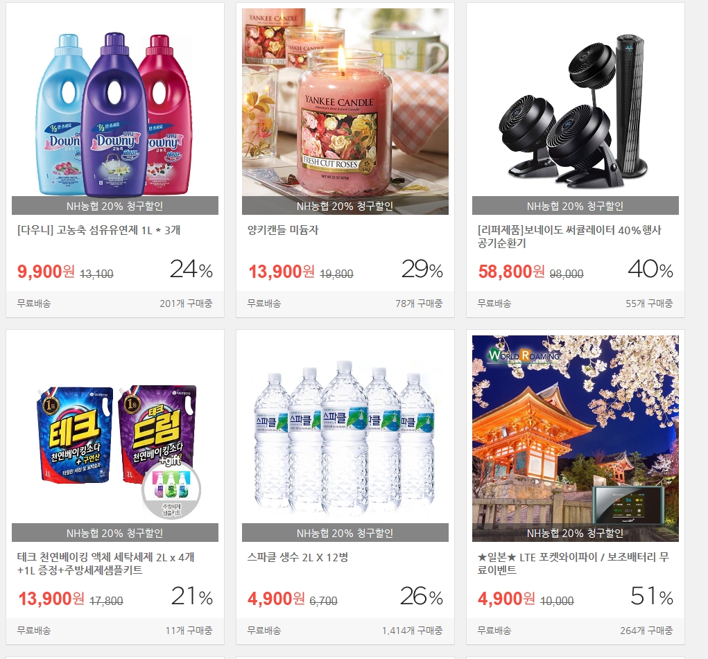 인터파크-NH채움카드 20% 청구할인 품목들이 보이네요.