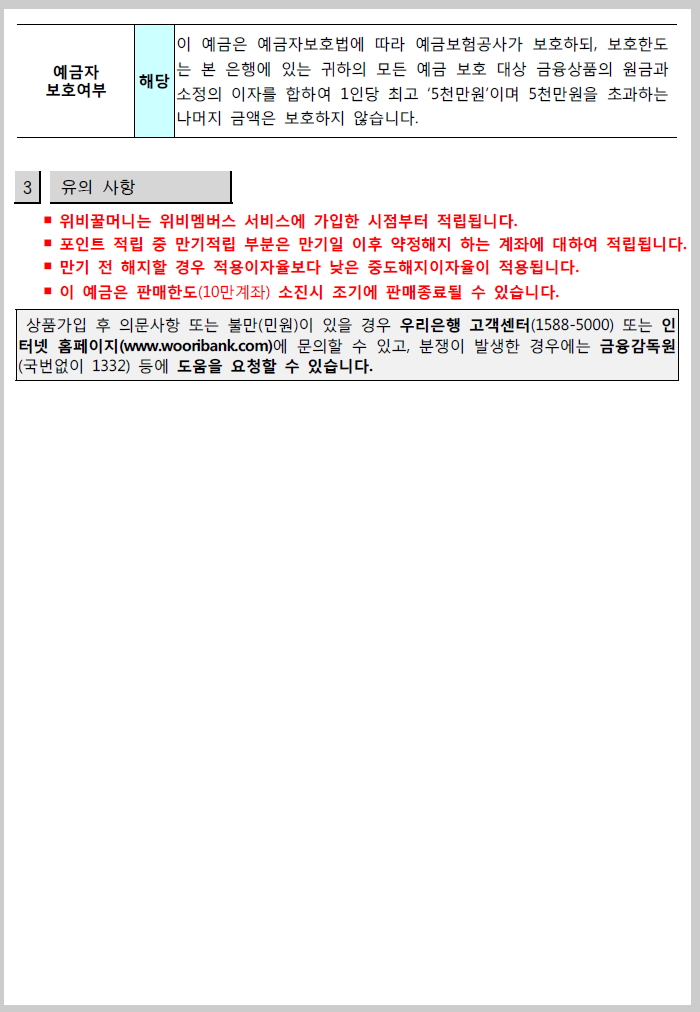 - 적금 기본금리에 추가로 적금납입금액의 1%를 위비꿀머니로 제공하여, 1년 정기적금 기준 최고 연 3.44% 금리수준