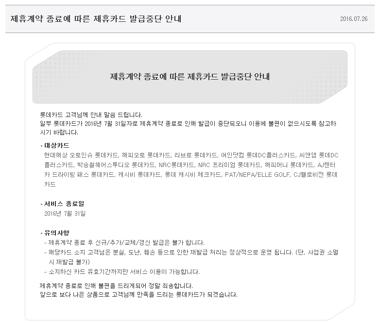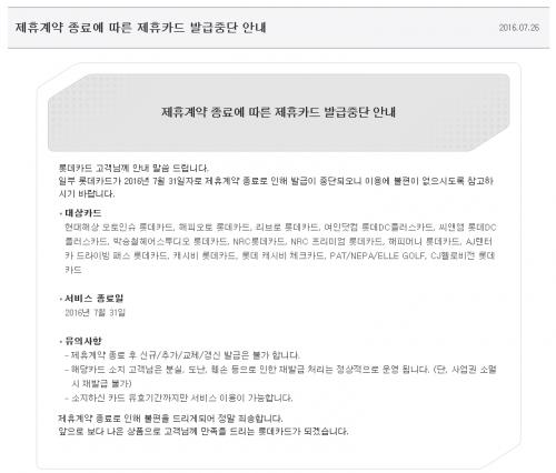 일부 롯데카드가 2016년 7월 31일자로 제휴계약 종료로 인해 발급이 중단되오니 이용에 불편이 없으시도록 참고하시기 바랍니다.