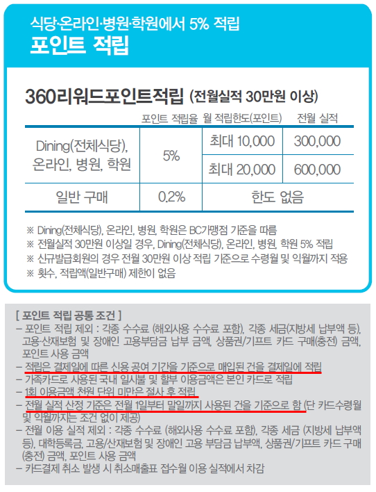 - 포인트 적립 제외 : 각종 수수료 (해외사용 수수료 포함), 각종 세금(지방세 납부액 등), 고용·산재보험 및 장애인 고용부담금 납부 금액, 상품권/기프트 카드 구매(충전) 금액, 포인트 사용 금액
