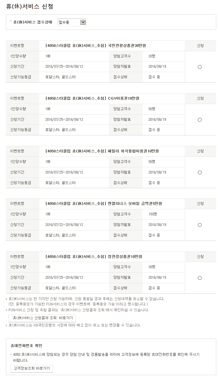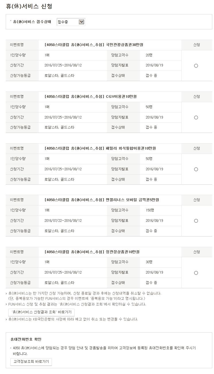 KB국민은행]4050스타클럽 休 서비스 추첨 신청안내(7.25-8.12)
