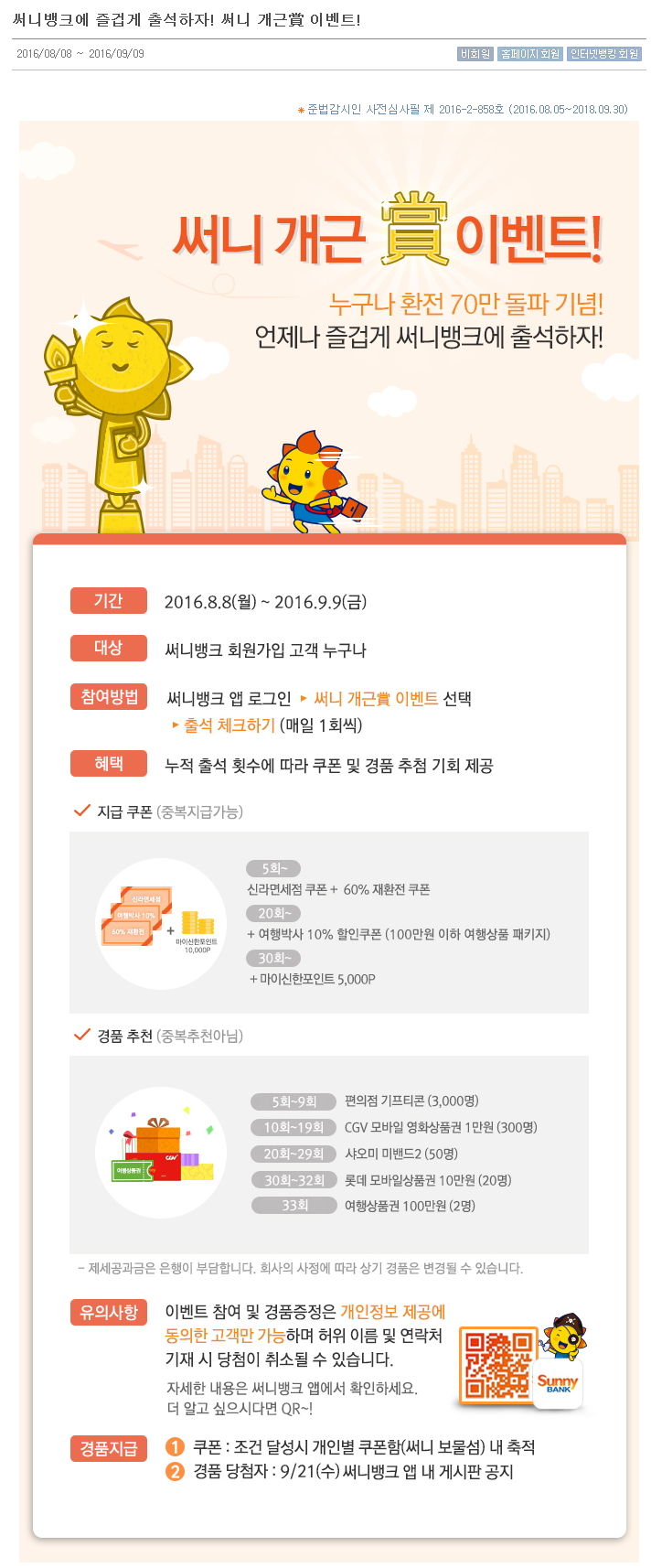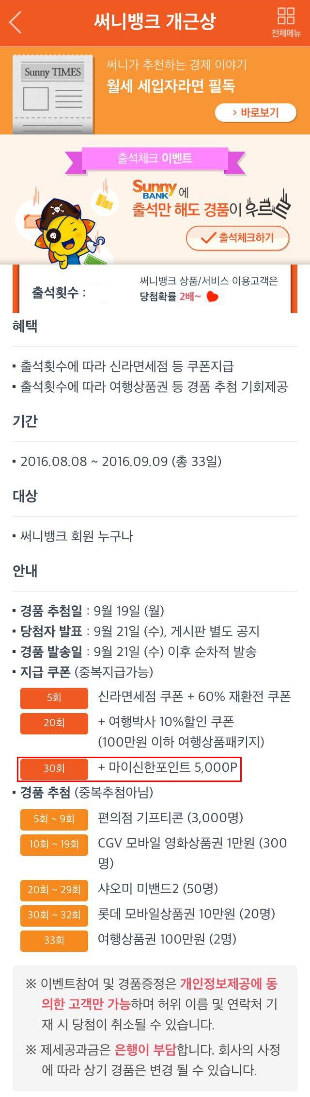 신한은행]써니뱅크App 출석 이벤트(8.8-9.9)