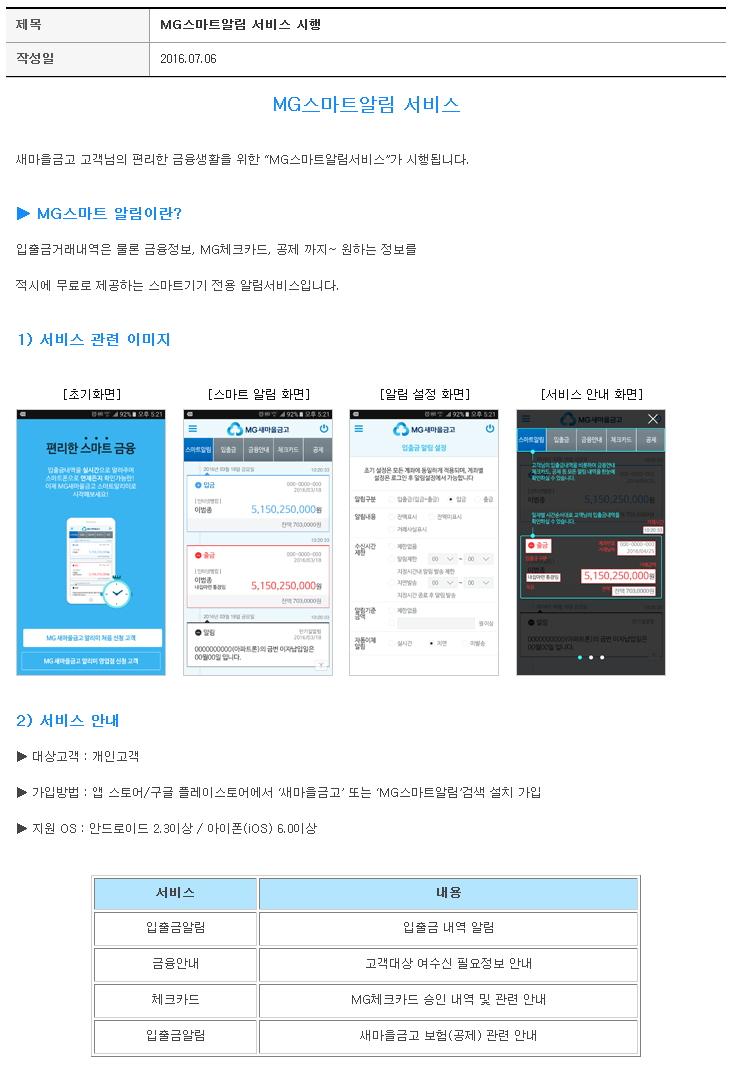 산림조합의 경우는 영세한 규모라서 과연 스마트알림 서비스가 가능할지 모르겠습니다. 그외에도 신협의 경우는 가능할 것 같습니다. | ||