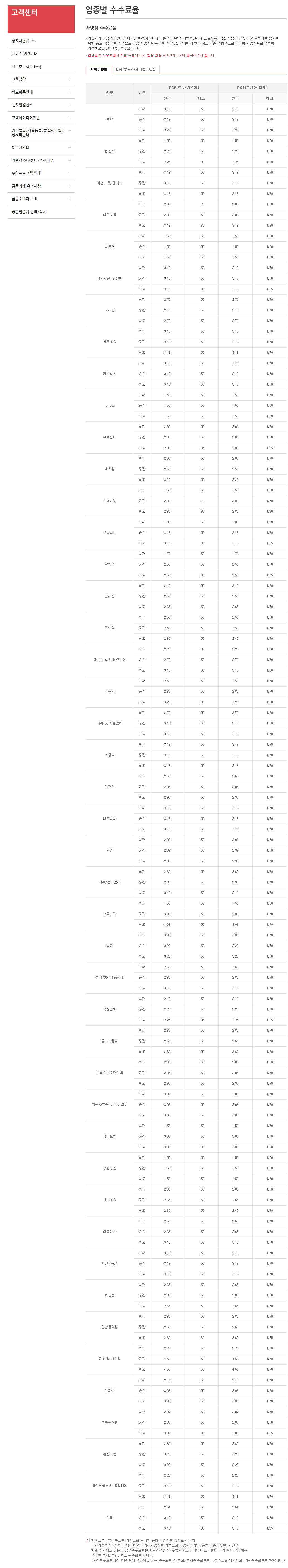 2. BC카드 업종별 수수료율은 다음과 같습니다.
