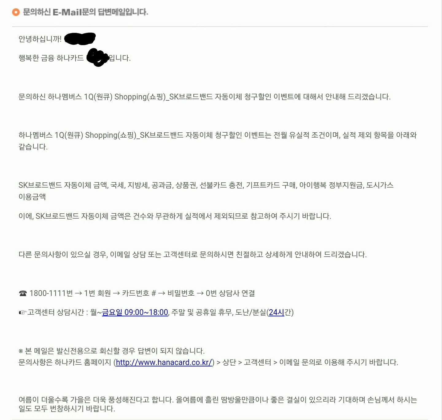 하나 skb 1Q 쇼핑 카드- skb 청구할인 실적제외항목