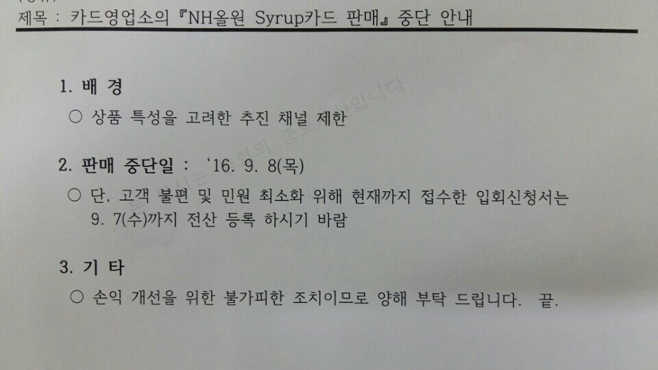 농협 시럽카드 내일부터 발급중단됩니다(사업소만중단인듯합니다) > 재테크포럼